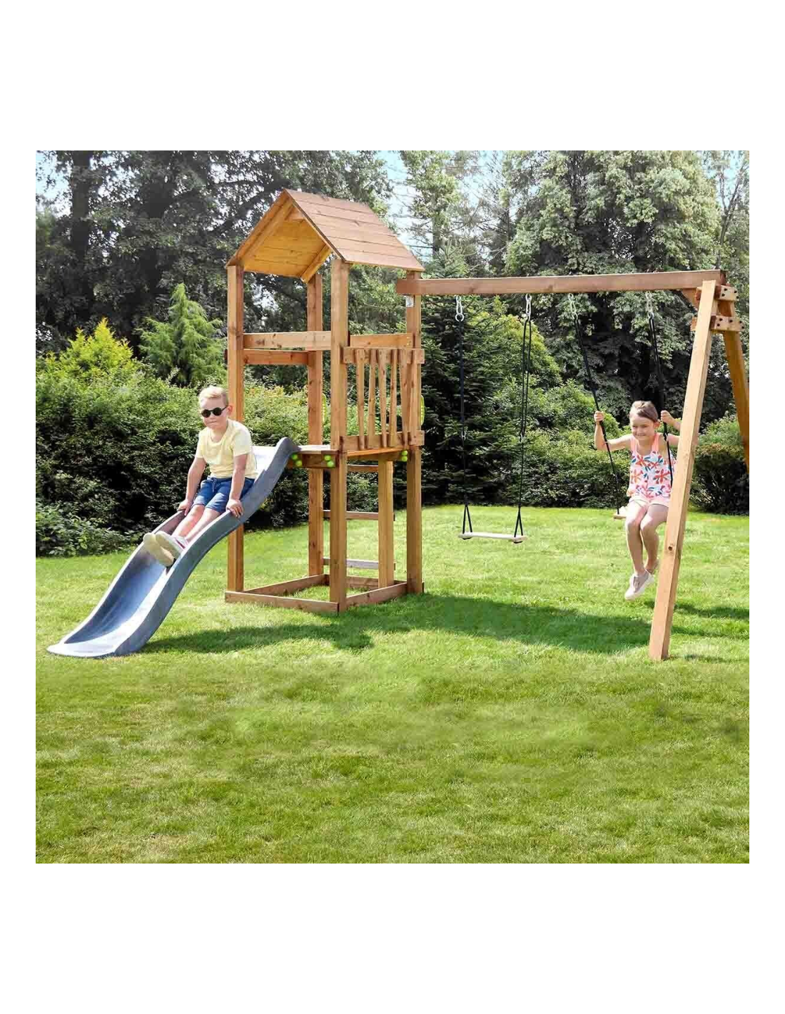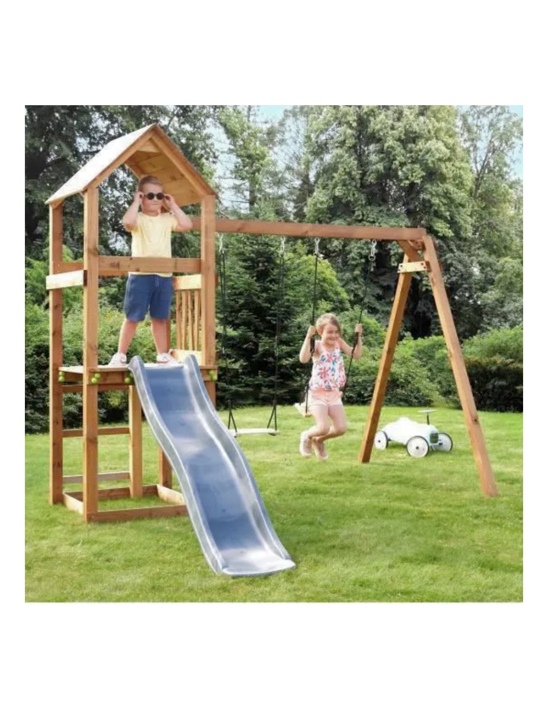 Pour 5 enfants, avec deux balançoires et une plate-forme avec toboggan.