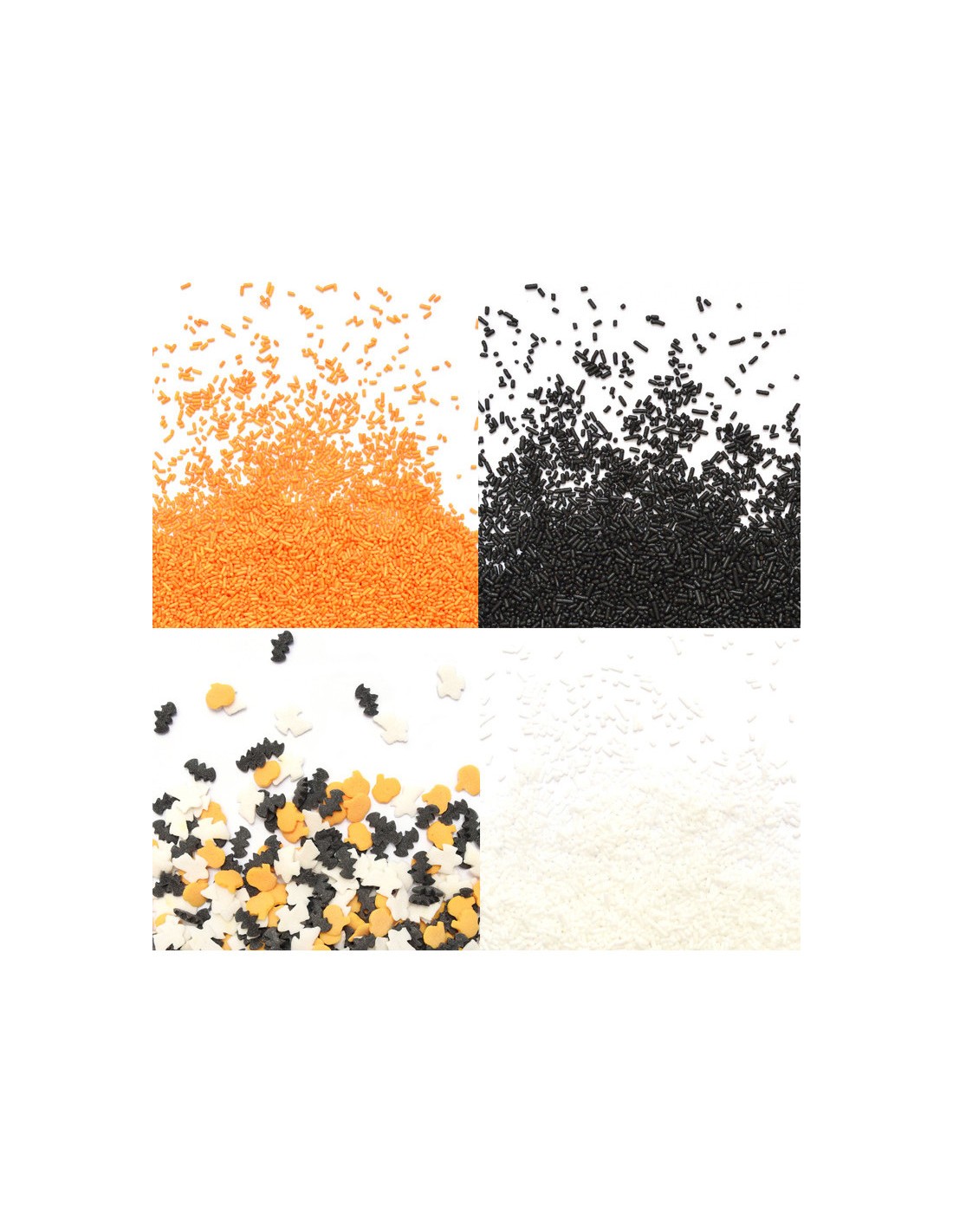 Le Mix de décors sucrés Halloween de ScrapCooking® est un assortiment de 4 tubes de décors en sucre, parfait pour ajouter une touche d'épouvante et de gourmandise à vos créations pâtissières lors des festivités d'Halloween. Cet assortiment est composé de vermicelles noirs, oranges, blancs et d'un mix de formes Halloween (fantôme, chauve-souris, citrouille), prêt à être saupoudré sur vos gâteaux, biscuits, cupcakes et autres délices.