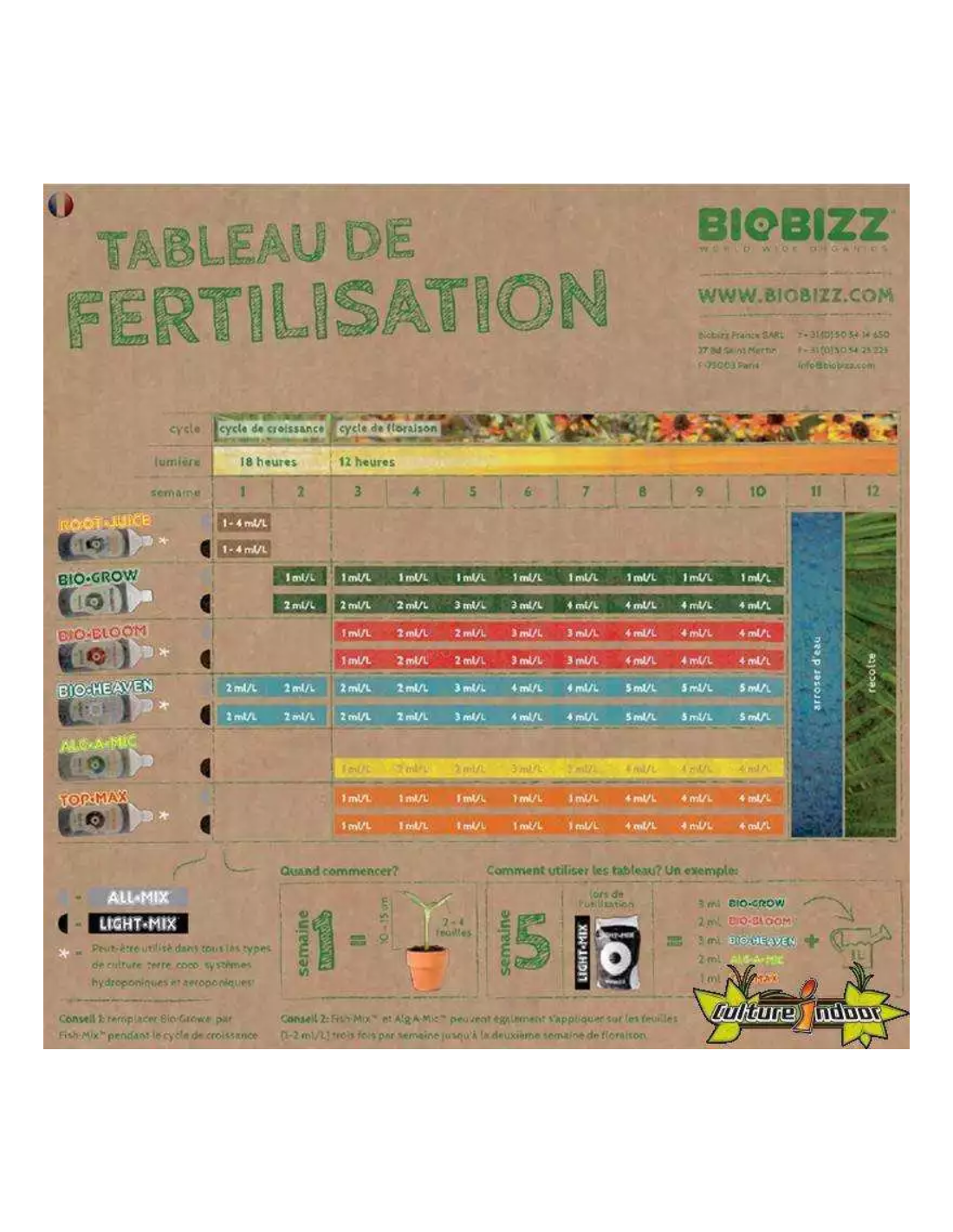 - Dosage indicatif : voir le Nutrient Schedule Biobizz, généralement de 1 à 4 ml par litre d’eau selon le stade de développement.