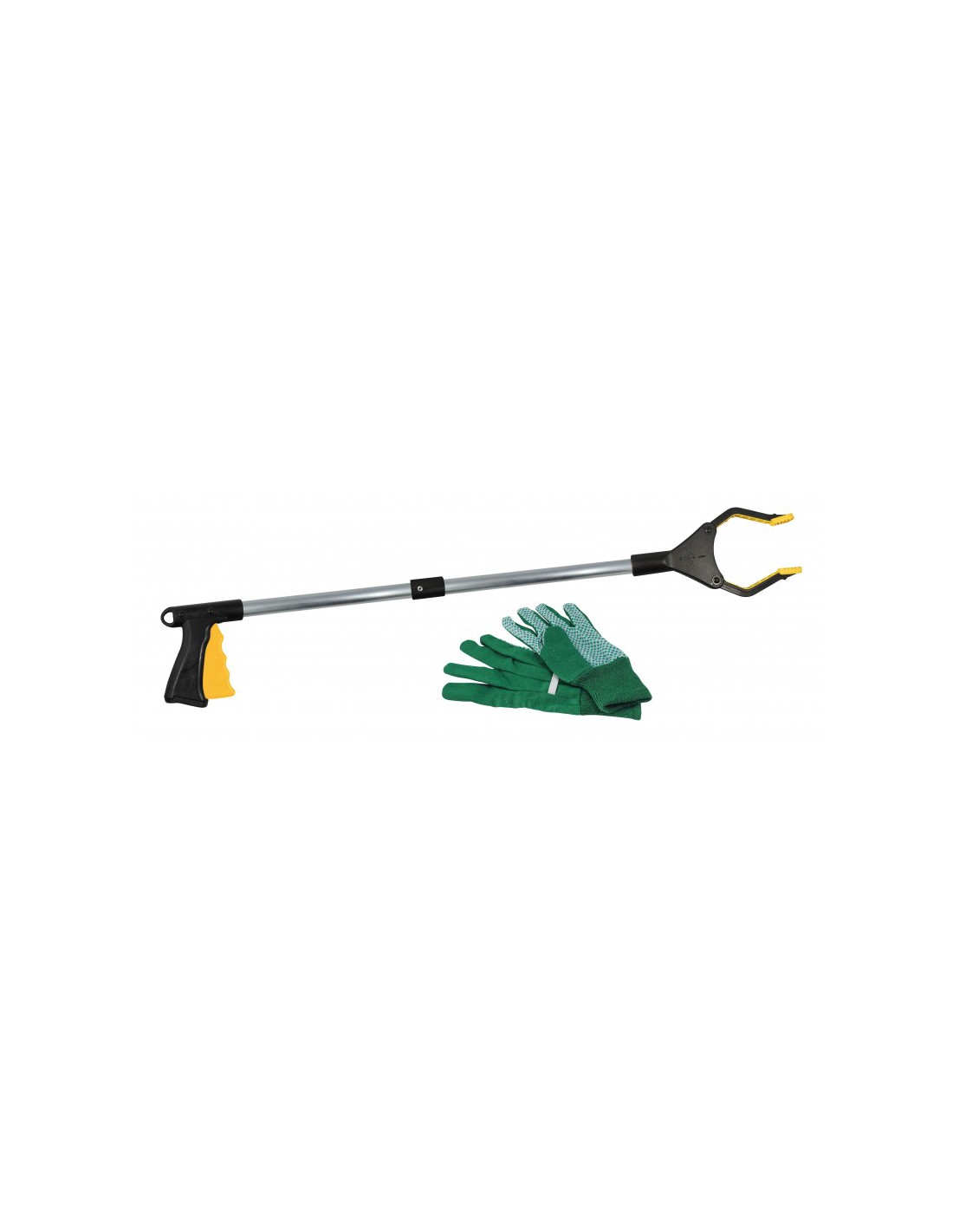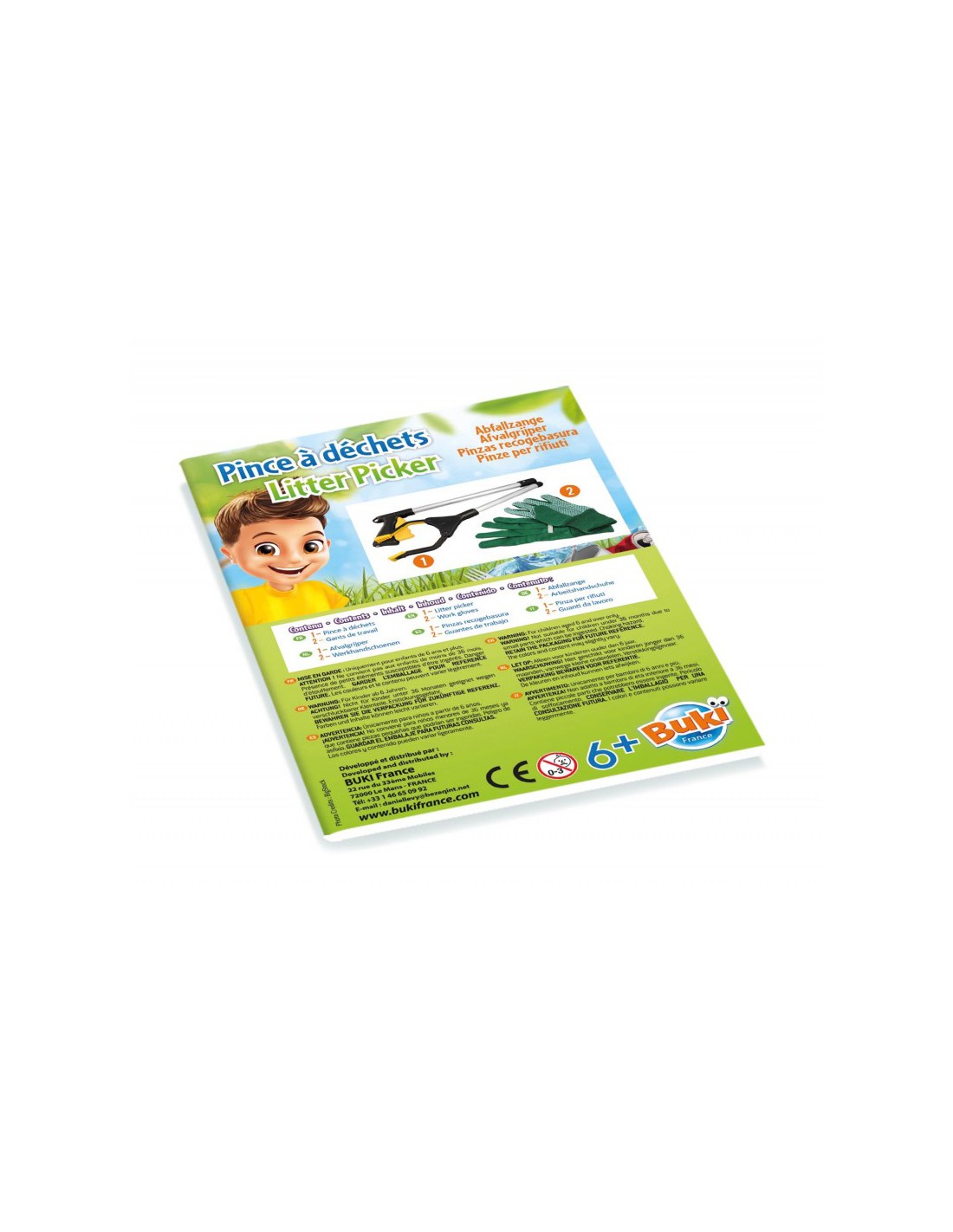1 pince à déchets, 1 paire de gants de travail, 1 notice illustrée en couleurs.