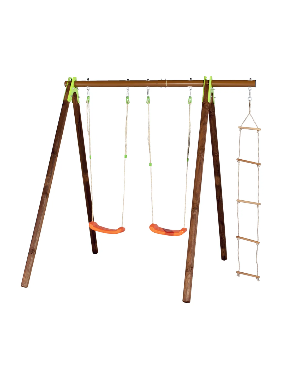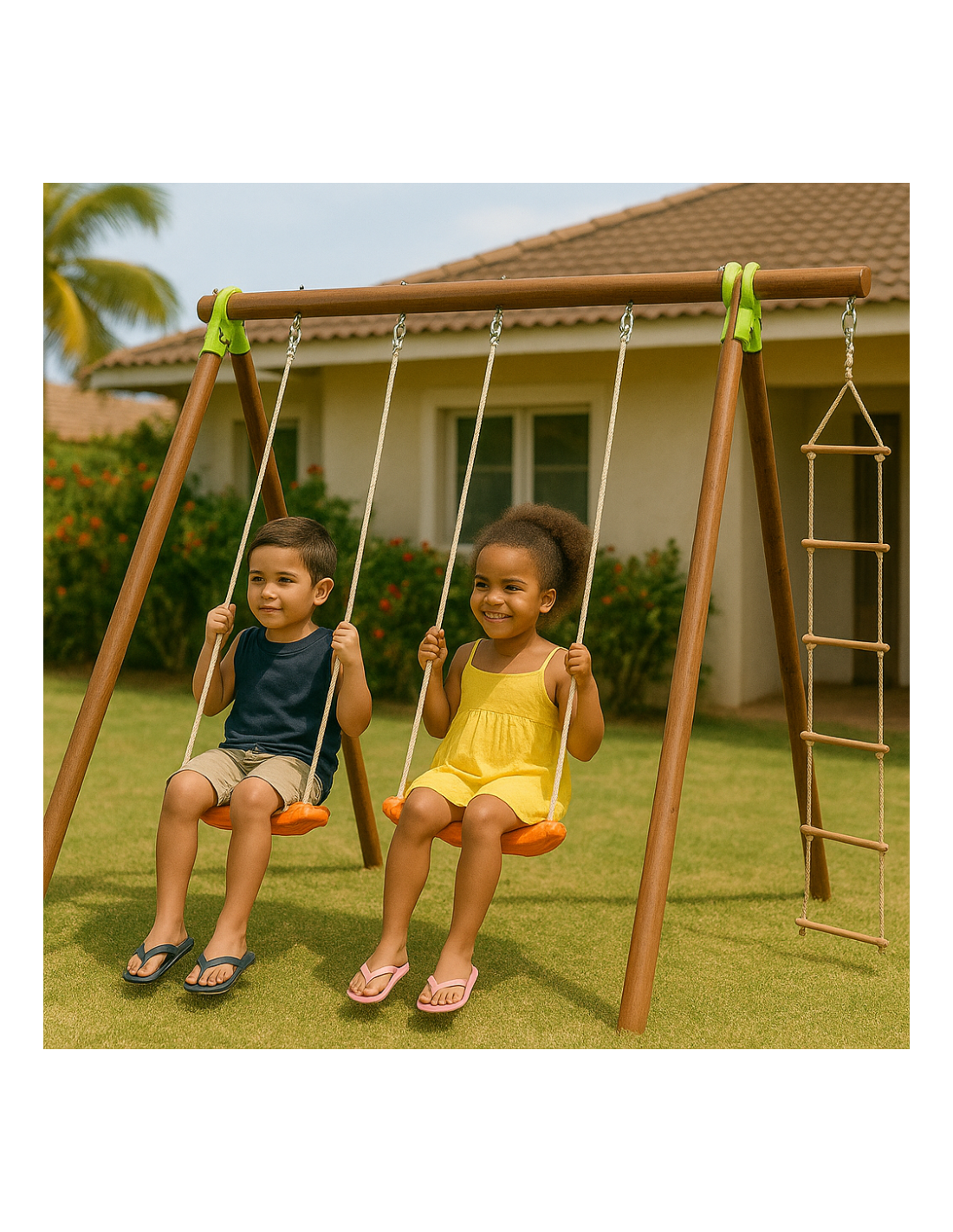 Pour 3 enfants, avec deux balançoires et une échelle de corde.