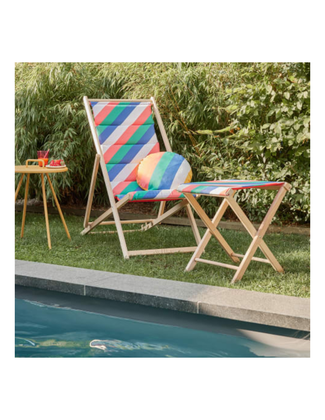 La chilienne Shiny de la marque ECLOZ associe une structure en bois de hêtre et un tissu déperlant design pour offrir un confort ergonomique, tout en étant pliable pour un rangement facile.